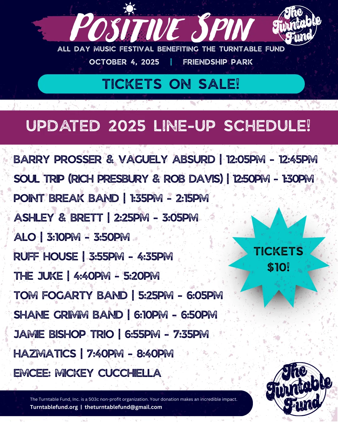 Join us for a day of live music, good vibes, and celebrating 5 years of positivity at The Turntable Fund - Positive Spin Music Festival!