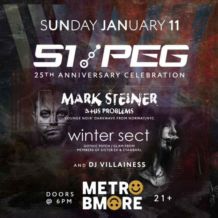 Jan 11 Featured 6:00 pm 51 PEG – 25TH ANNIVERSARY SHOW W/ MARK STEINER & HIS PROBLEMS, WINTER SECT AND DJ VILLAINESS Metro Baltimore 1700 N Charles St, Baltimore Event Details Get Directions